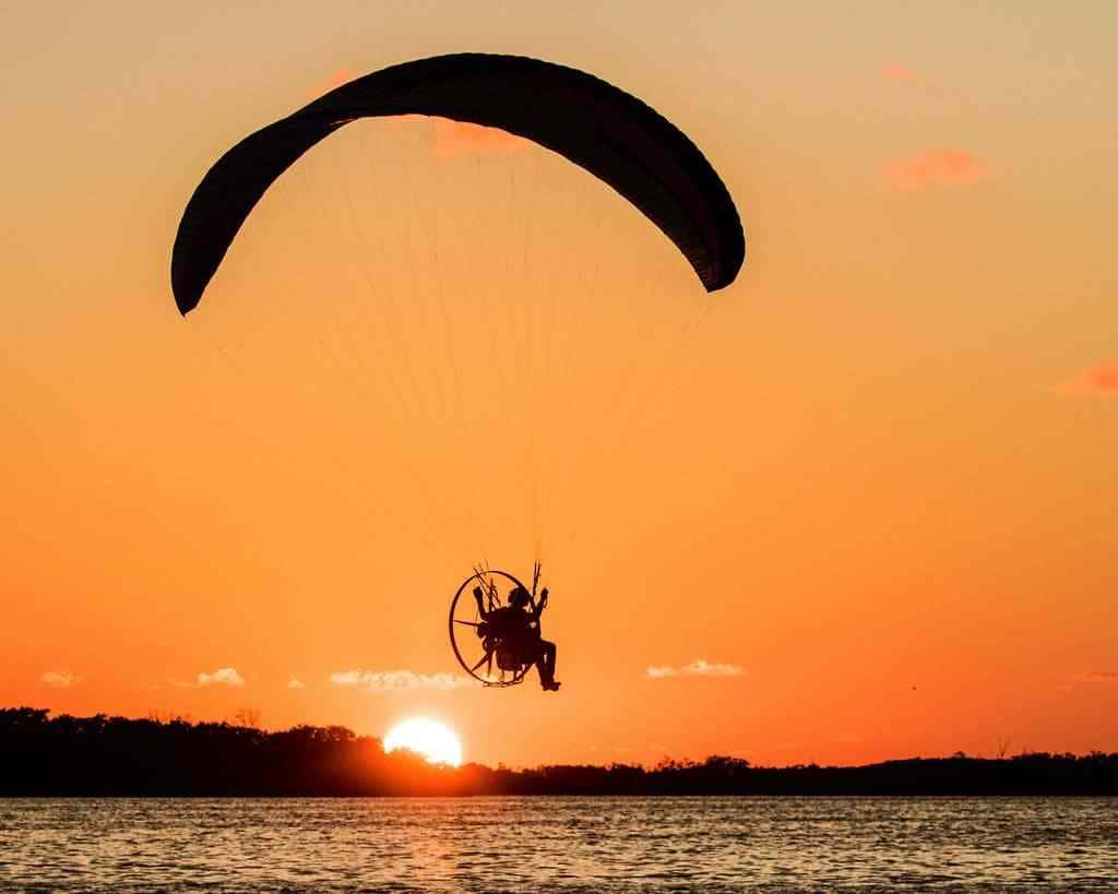 Elevate your beach experience with paramotoring at sunset, a magical and serene flight that paints the sky with hues of orange and pink, creating a mesmerizing and romantic atmosphere.